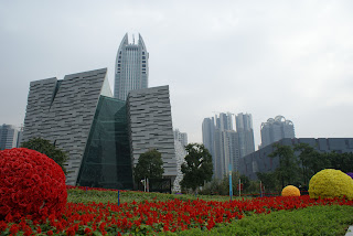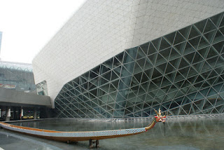Já disse que o meu objectivo era ver o Guangzhou Opera House da Zaha Hadid. Mas qual não foi a minha estupefacção quando subo à terra vinda do metro e deparo-me com uma praça imensa cheia de edifícios de uma arquitectura cuidada e arranjos exteriores apelativos aos nossos sentidos, com a dita Torre de Cantão como observatório de toda esta revolução num espaço que agora se tornou nobre. Ou seja, afinal a Opera House da Zaha é apenas um mero figurante entre a Torre de Cantão, o Museu de Guangdong, a Biblioteca de Guangzhou e as Torres Gémeas de Guangzhou (por enquanto ainda uma só). E, afinal, só nesta área imensa, mas apenas uma pequeníssima parte de Guangzhou, era merecedora de um dia inteiro. Resultado: como queria mesmo ver com atenção todos os contornos e formas do edifício da Zaha, percorrendo todo o seu exterior, acabámos por perder aqui umas horitas do nosso dia.
