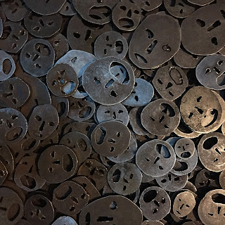 rostos de metal, todos diferentes, que quando pisados por quem percorre este