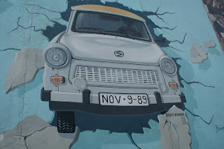 O Trabant, carro icónico da formação comunista da Alemanha Oriental, a rebentar pelo muro, obra de Birgit Kinder, é outra das pinturas mais conhecidas.